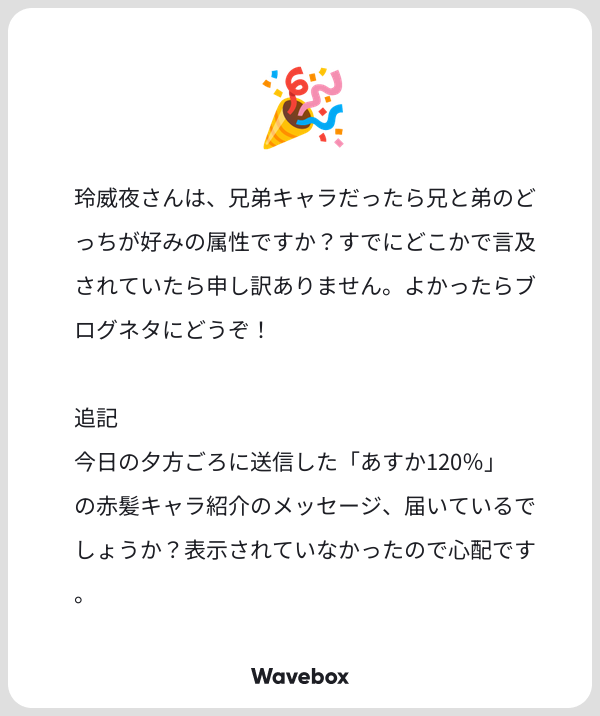 兄弟キャラについてですが、めっちゃ悩みますね。え~~~~・・・・うー---ん・・・・どっちも好きなんですよねえ~自分が一人っ子なので、兄という存在にも憧れますし、弟が慕ってくれるのも嬉しいですし。