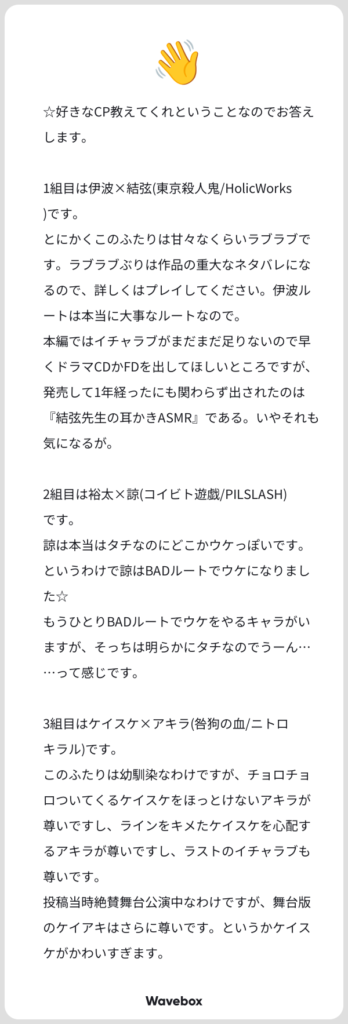3つも好きなCP送っていただきありがとうございました👍燃えが伝わりました!!!