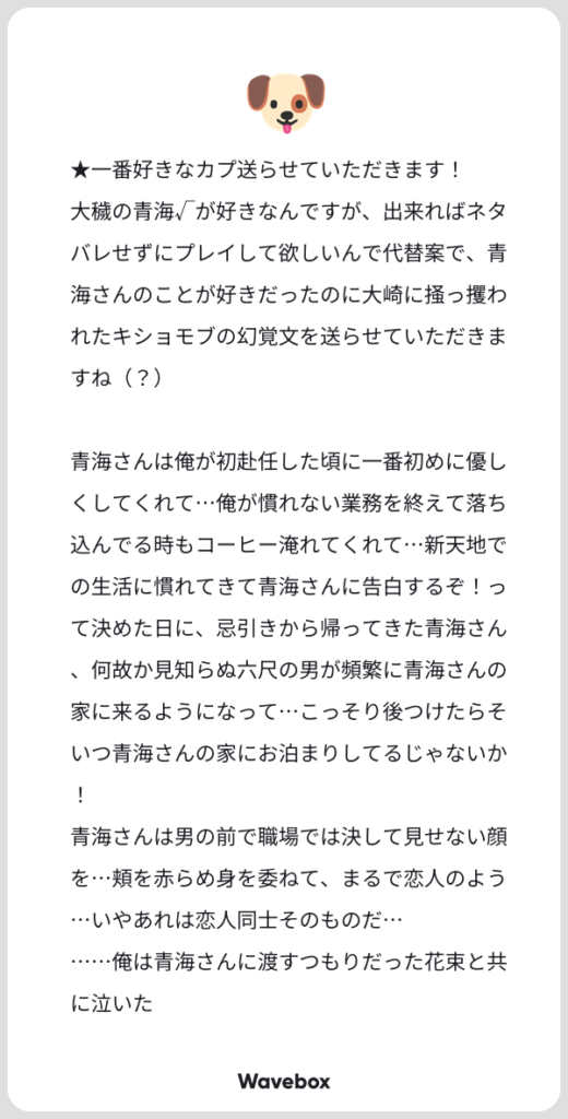 今回は以前募集した好きなCPを語る記事になっております。私は送られてきたアツゥイプレゼンにうんうんと相槌を打つような感じです。よろしくお願いします。