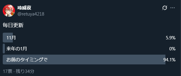 何を悩んでいるかと言うと、毎日更新の更新日をどうするかってことですね。今のところ来年の1月から毎日更新をしようと進めてきたんですけど、11月毎日更新でもいけそうなんですよ。