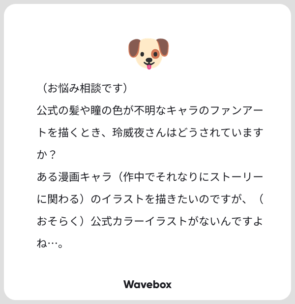 「公式カラーがないため、全て想像です!ご了承ください!」とか一言付け加えれば、万事解決だと思います。それで文句言ってくる人はいないでしょう。多分。