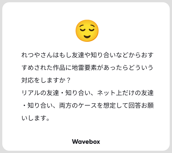 素直に断ります。理由も添えますね。まあ、これも知り合い度によるんですけど(よるんかい)、リア友よりネッ友のほうが言いやすいかも・・・・?というより、ネッ友のほうが俺の好みを熟知していて、地雷避けてくれる感じある。いつもみんなありがとう!