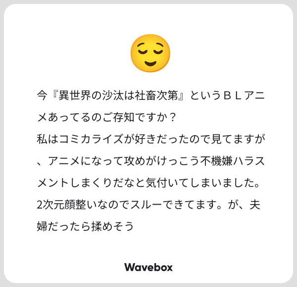 あの~この前二次創作にハマっているって言ってたじゃないですか?あれが加速しましてね・・・・ええ・・・・原作のアニメ1話観てみました。まだ二人の絡みはなかったですが、大変良かったですね・・・