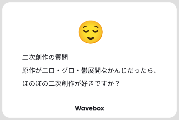 うわ~これ悩みますね。どっちも好きが正解かも。原作にないエロ、グロ、鬱を二次創作で浴びるのも楽しいだろうし、パロディ?みたいな感じでほのぼのを摂取するのも楽しそう。双方いい味があって楽しめそう。