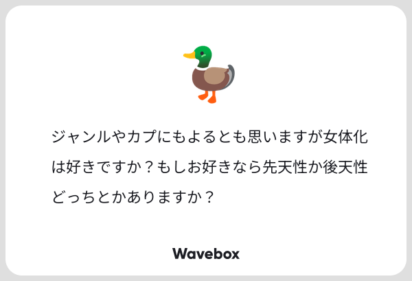 いや、女体化結構いいよ。女体化ならではの良さがある。語彙力が足りなくて説明は難しいけど、「可愛い!!!」とか、片方だけ女体化だと「ああ、〇〇くんメスの顔してるよ。対する〇〇くんはオスの顔しているよ・・・・」とか色々な燃えやギャップが垣間見えて・・・・・GOODです。